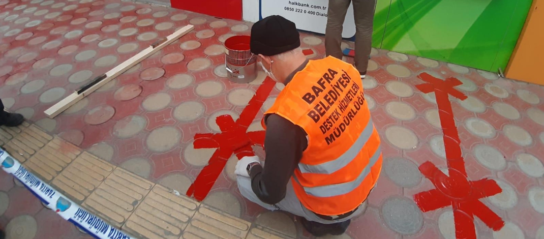 Bafra Belediyesi ilçe sınırları içerisindekitoplu kullanım alanlarının başında yer alan bankamatikleri ve etrafını yeniden sterilizeederek, 1 metrelik güvenli sosyal mesafe alanı oluşturdu.