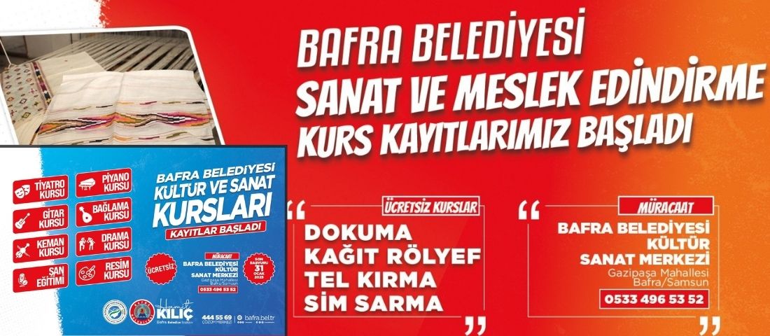 Gazipaşa Mahallesinde bulunan Bafra Belediyesi Kültür ve Sanat Merkez’inde devam eden her iki kurs için başvurular 31 Ocak tarihinde sona erecek.