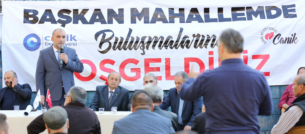 Canik belediyesi tarafından başlatılan” Başkan Mahallemde” buluşmaların yedincisi belediye evleri mahallesinde gerçekleştirildi. Canik belediye başkanı İbrahim Sandıkçı’nın yanı sıra mahalle muhtarı Rıfat Öktem, Ak parti teşkilatlardan sorumlu başkan yardımcısı Adem Çakır, Ak parti yerel yönetimlerden sorumlu Başkan yardımcısı Nihat Gönen, Ak parti Canik ilçe kadın kolları başkanı Gülay Korucu, Meclis üyeleri ve vatandaşlar katıldı. Cuma namazı sonrası yapılan programda vatandaşlar, mahallelerinde yaşadıkları sorunlar ile ilgili dertlerini bizzat belediye başkanı İbrahim Sandıkçı ya ileterek çözüm sürecinin daha hızlı yerine getirildiği söyleyerek bundan duydukları memnuniyeti dile getirdiler.