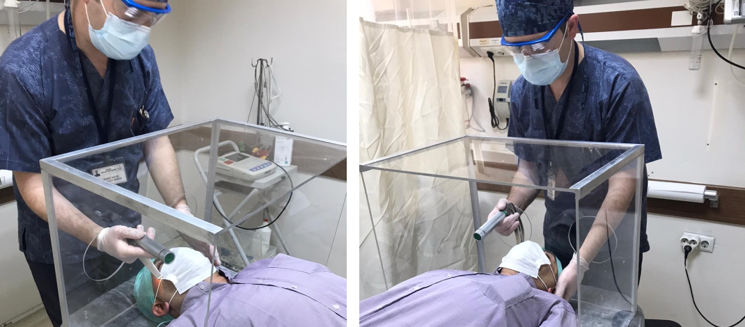 Hastaların muayeneleri esnasında kullanılan cam kabinin virüsün doktor ve sağlık çalışanlarına bulaşmasını önleme konusunda koruyucu kalkan görevi gördüğünü söyleyen Dr Mustafa Seven, ‘’Hekim arkadaşlarımız ve sağlık çalışanlarımızın muayene esnasında, enfeksiyonel bulaşmayı engelleyici olarak tasarladığımız bu aparat, uzun çalışmaların ardından ortaya çıktı.Sağlık çalışanlarımızın yaptıkları ve en çok bulaşma riskinin olduğu entübasyon esnasında, sürüntü almada veya corona virüs testi alınması gibi işlemler sırasında bulaş riskinden korumak amaçlı yaptığımız bu örnek teçhizata henüz bir isim de vermedik. Bildiğim kadarıyla Türkiye’ de bir benzeri de bulunmayan bu aparata , bulaş engelleyici, bulaş önleme bariyeri, veya bulaşmanın havaya yayılma riskinin en yüksek olduğu ambulama durumunda kullanılabilecek olması hasebiyle entübasyon ambu koruma kabini gibi isimler de verilebilir’’ dedi