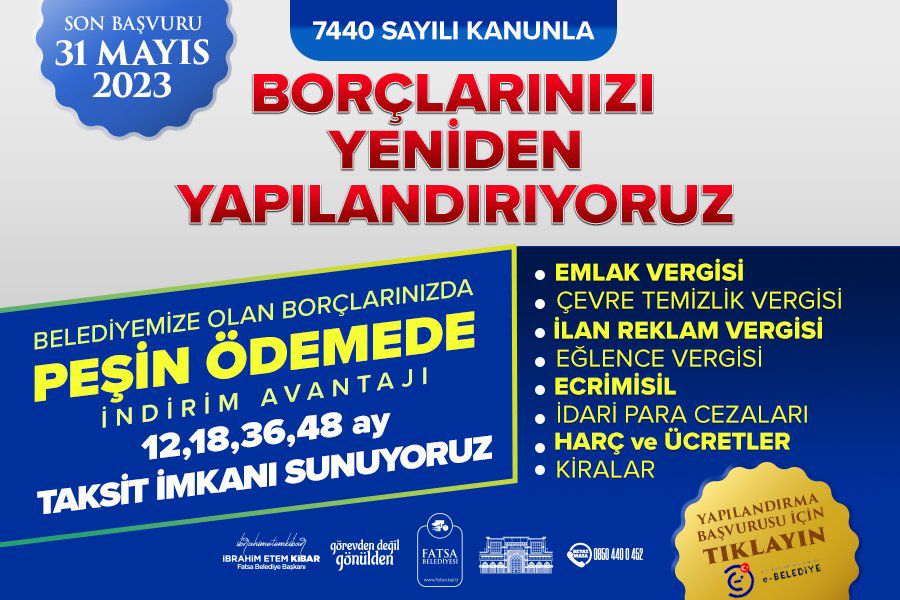 Fatsa Belediyesi Mali Hizmetler Müdürü Olgun İnağ, “Belediyemiz tarafından beyana dayalı bildirimlerde bilgi güncellemeleri ve eşleştirme işlemleri devam ediyor ”dedi.Konu ile ilgili açıklamada bulunan Fatsa Belediyesi Mali Hizmetler Müdürü Olgun İnağ , “Belediye Başkanlığı Kasım 2022 tarihi itibariyle İçişleri Bakanlığı tarafından sağlanan e-belediye otomasyon sistemine geçmesi nedeniyle 2023 yılı itibariyle, geçilen e- belediye otomasyon sistemi üzerinden sicil ve beyana dayalı vergilerde, MERNİS ( Merkezi Nüfus İdare Sistemi), TAKBİS (Tabu ve Kadastro Bilgi Sistemi) ve MAKS (Mekânsal Adres Kayıt Sistemi) sistemine entegreli olarak veri güncelleme ve eşleşme işlemlerine hızlı bir şekilde devam ediyor. Bu işlemler için Belediye’nin giriş katında vatandaşlara daha hızlı ve verimli hizmet sunabilmek için başvuru masaları oluşturuldu ”dedi.‘BİN ADET GÜNCELLEME VE EŞLEŞME İŞLEMİ YAPILIYOR’Toplam eşleşecek Bina, Arsa ve Arazi için yaklaşık 255 bin beyan bulunduğunu söyleyen Fatsa Belediyesi Mali Hizmetler Müdürü Olgun İnağ, “Yaklaşık olarak 60 bin beyan güncelleme ve eşleşme işlemleri tamamlanmıştır. Günlük ortalama 1000 adet güncelleme ve eşleşme işlemleri yapılmakta olup, 2023 Ekim sonu itibariyle bitirilmesi planlanmaktadır. Konu ile ilgili olarak mükelleflerimize SMS, belediye hoparlör ilanı ve Belediye Wep Sitesi üzerinde gerekli bilgilendirme işlemleri yapılmaktadır. Ayrıca 2023 yılı için tahakkuk eden emlak vergisi, çevre temizlik vergisi ve ilan ve reklam vergilerinin 1’inci Taksit ödemelerinin 31 Mayıs 2023 tarihine kadar yapılması gerektiği, vadesinde ödenmeyen vergi alacaklarının 6183 Sayılı A.A.T.U.H.K’nun 51’inci Maddesi kapsamında aylık %2,5 zam yediğini hatırlatmak isterim” diye konuştu.‘VERGİ AFFINDAN FAYDALANMAK İÇİN SON BAŞVURU’ Halk arasında vergi affı olarak bilinen, 7440 Sayılı Bazı Alacakların Yeniden Yapılandırılması Hakkında Kanunun halen yürürlükte olduğunu, Kanun kapsamında, vadesi 31.12.2022 tarihinden (bu tarih dâhil) önce olduğu hâlde bu Kanunun yayımı tarihi itibariyle ödenmemiş bulunan vergi borçlarının yapılandırılması için son başvuru tarihinin 30.06.2023 tarihinde sona erdiğini, mükelleflerin geçmiş dönem borçlarının yapılandırılarak kanunun getirmiş olduğu avantajlardan faydalanması önemlidir.
