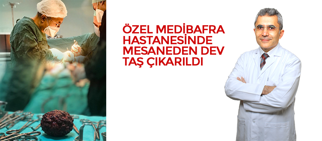 Özel Medibafra Hastanesinde 46 yaşındaki hastanın mesanesinden tek parça halinde 8 santimetre (cm) boyutunda ve 295 gram ağırlığında taş çıkarıldı. Çıkarılan mesane taşı, bugüne kadar hastanemizde çıkarılan en büyük mesane taşı olma özelliği taşıyor.