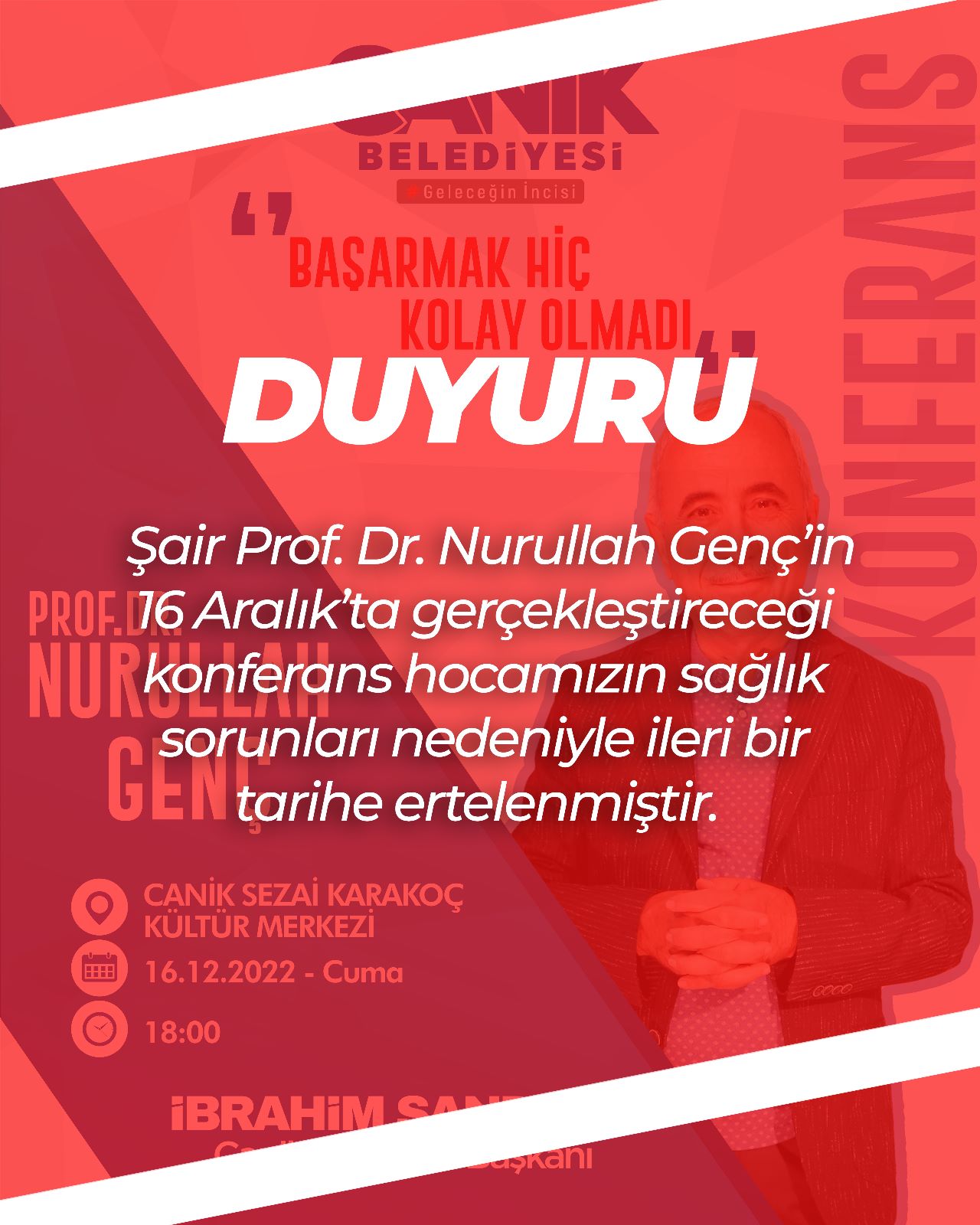 Canik Belediyesi tarafından yapılan yazılı açıklamada, “Şair-Yazar Prof. Dr. Nurullah Genç tarafından 16 Aralık Cuma Günü, Canik Sezai Karakoç Kültür Merkezi’nde gerçekleştirilecek olan “Başarmak Hiç Kolay Olmadı” konferansı, hocamızın sağlık sorunları nedeniyle ileri bir tarihe ertelenmiştir. Etkinlik tarihi ve saati ilerleyen günlerde duyurulacaktır” denildi.