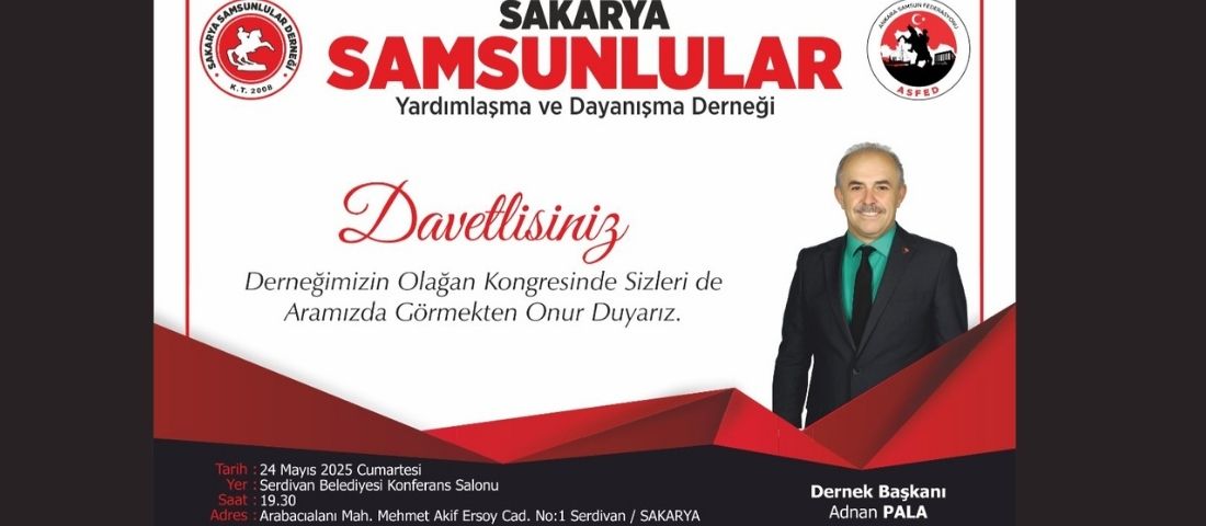 Sakarya Samsunlular Derneğimizin Genel Başkanı Adnan Pala 24 Mayıs Cumartesi akşamı saat:19:30 yapılacak, olağan 8. kongreye ve Samsunlu rahmetli sanatçımız Yıldıray Çınar‘ı ölüm yıl dönümünde anma programına davet ediyor…