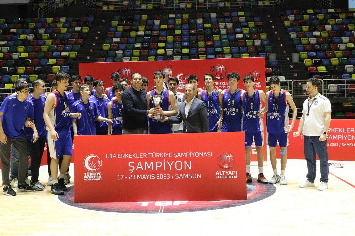 Samsun’un ev sahipliğinde düzenlenen Basketbol U14 Erkekler Basketbol Türkiye finalinde Fenerbahçe’yi 80-65 yenen Anadolu Efes şampiyonluk kupasını kaldıran taraf oldu.16 TAKIM YARIŞTIBasketbol U14 Erkekler Türkiye Şampiyonası finallerine Samsun ev sahipliği yaptı. 16 takımın yer aldığı şampiyona Yaşar Doğu Spor Salonu’nda 17-23 Mayıs tarihleri arasında oynanan 40 maç ile sona erdi. Yarı final maçlarında İstanbul Bahçeşehir Okulları’nı 79-63 skorla geçen Fenerbahçe U14 Erkek Basketbol Takımı ile MG Spor Kulübü’nü yarı finalde 70-56 mağlup eden Anadolu Efes U14 Erkek Basketbol Takımı final müsabakasında karşı karşıya geldi.FİNAL NEFES KESTİFenerbahçe’yi 80-65 yenmeyi başaran Anadolu Efes, Türkiye şampiyonu oldu. Fenerbahçe ikincilik, MG Spor Kulübü ise üçüncülük kupasının sahipleri oldular. U14 Erkekler Türkiye Şampiyonası’nın en iyi beşinde Anadolu Efes’ten Ömer Kutluay ve Demir Öztürk, Fenerbahçe’den Kaan Belgutay, MG Spor Kulübü’nden Yağız Kılıç ve Bahçeşehir’den Aras Atlı yer aldı. Turnuvanın en değerli oyuncusu ise Ömer Kutluay oldu.KUPALAR VERİLDİSamsun Gençlik ve Spor İl Müdürü Feyzullah Dereci, Türkiye Basketbol Federasyonu Altyapı Faaliyetleri Müdürü Gökhan Sunter, şube müdürlerimiz ve ilçe müdürlerimiz, Samsun Basketbol İl Temsilcisi Özhan Turan ile çok sayıda taraftar final karşılaşmasını heyecanla takip etti. Maç sonunda düzenlenen ödül töreni ile dereceye giren takımlara ödülleri takdim edildi. İl Müdürü Feyzullah Dereci, dereceye giren takımları tebrik etti.Köksal ÖNER
