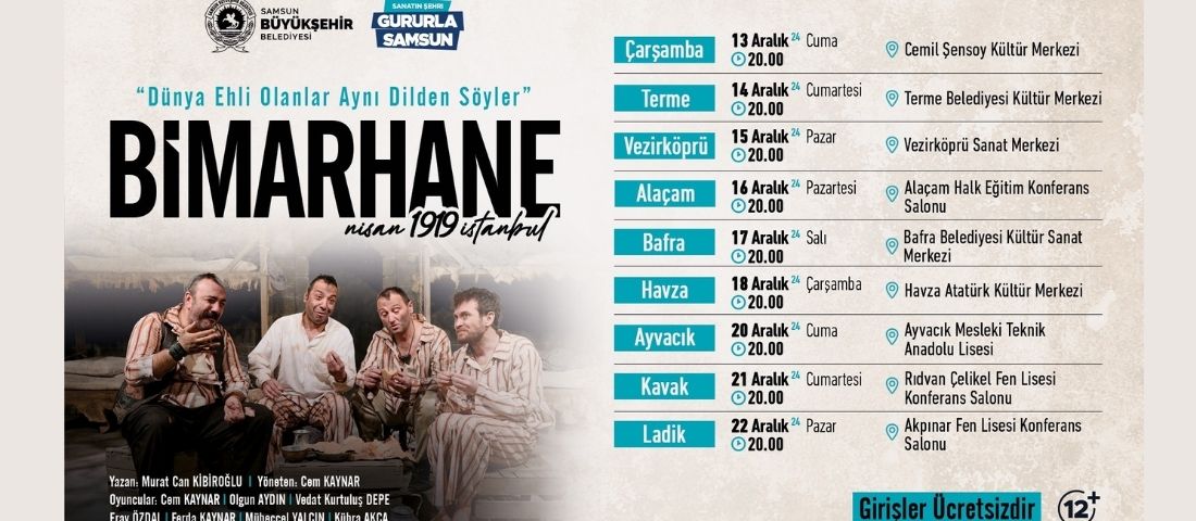 Büyükşehir Belediyesi’nin organizasyonu ile 17 ilçede sahnelenecek “Dünya Ehli Olanlar Aynı Dilden Söyler” sloganıyla sahnelenen Bimarhane tiyatro oyunu ilk olarak 13 Aralık Cuma günü saat 20.00’de Çarşamba ilçesinde sanatseverlerle buluşacak. Aralık ayında 17 ilçenin 9’unda sahnelenecek oyun her ay planlanarak diğer ilçelerle de buluşturulacak.Bu kapsamda Bimarhane tiyatro oyunu ilk etapta; 13 Aralık’ta Çarşamba İlçesi, 14 Aralık Terme İlçesi, 15 Aralık Vezirköprü İlçesi, 16 Aralık Alaçam İlçesi, 17 Aralık Bafra İlçesi, 18 Aralık Havza İlçesi, 20 Aralık Ayvacık İlçesi, 21 Aralık Kavak İlçesi ve 22 Aralık tarihinde Ladik İlçesinde sahnelenecek.