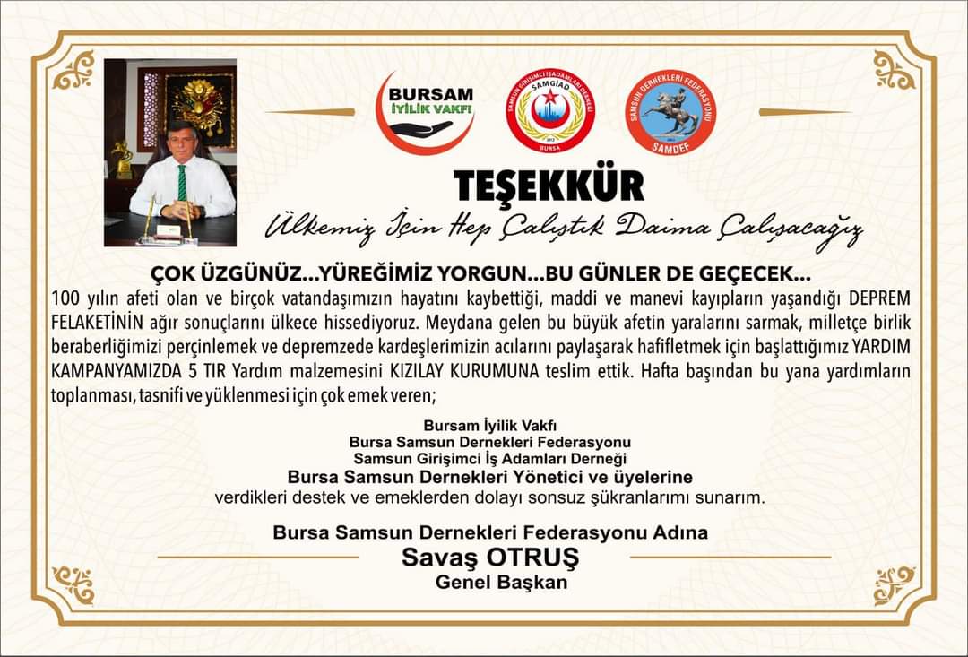 Bursa Samdef Genel Başkanı Savaş Otruş, asrın felaketi olarak yaşadığımız deprem bölgesine gönderilmek üzere açtıkları Yardım kampanyasına destek veren ve tırlar dolusu yiyecek ve giyecek yardım malzemelerini temin ederek Samdef’e teslim eden yardımsever vatandaşlarımıza, bu yardımların tasnif edilerek, paketlenip yüklenerek deprem bölgesine ulaştırılmasına katkıda bulunan Federasyon ve Dernek üyelerine teşekkür etti.