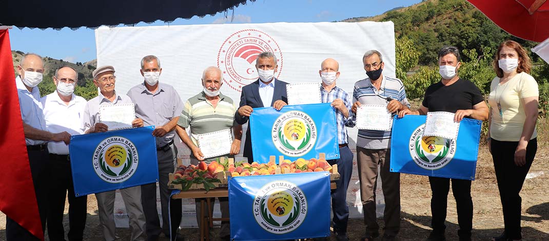 İl Tarım ve Orman Müdürü İbrahim SAĞLAM Canik İlçesi Demirci Köyünde Entegre Kontrollü Ürün Yönetimi Projesi (EKÜY) kapsamında Entegre Mücadele Prensipleri doğrultusunda üretim yapan şeftali üreticilerinin hasat öncesi alınan numune sonuçları kalıntısız çıkan 50 ton ürünün sertifika, logo ve EKÜY bayraklarını üreticilere teslim etti.