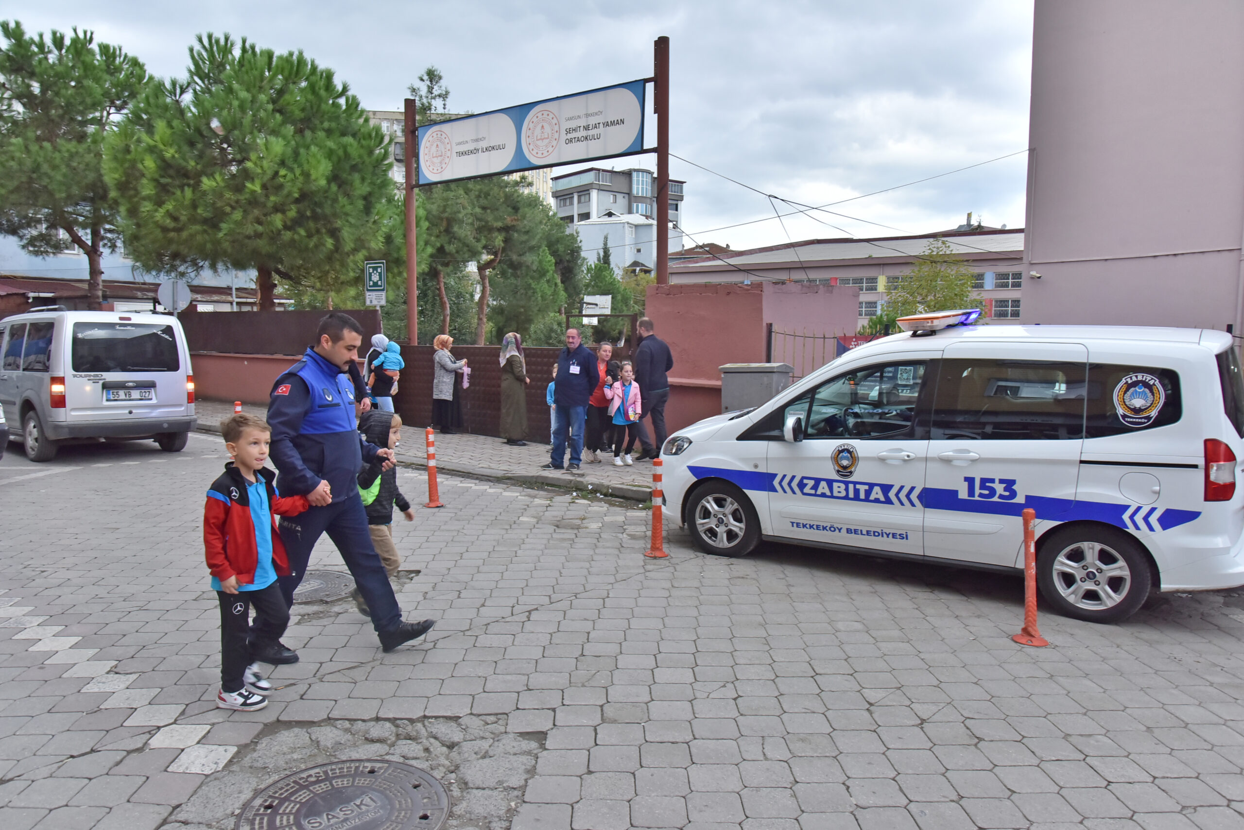 Tekkeköy’de zabıta okul önlerinde öğrencileri bekliyor çocuklar güvenle okullarına gidiyor.