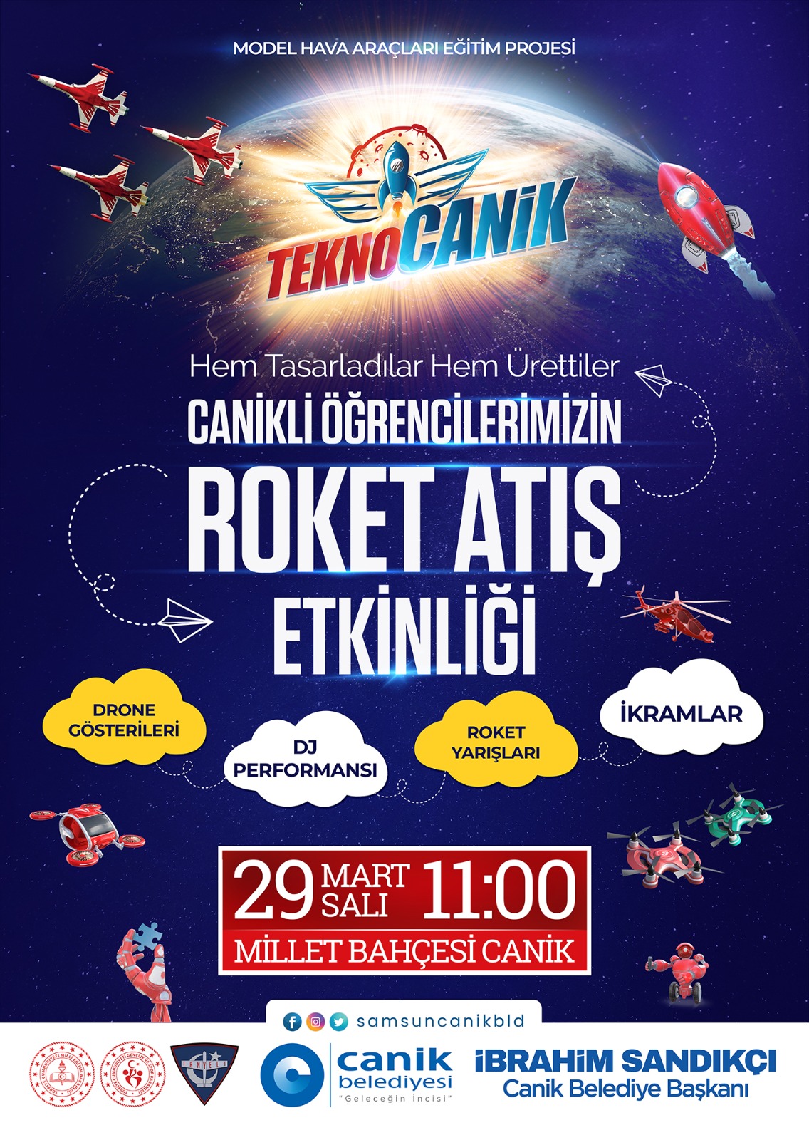 Canik Belediyesi tarafından ilçedeki ortaokullarda ve liselerde gerçekleştirilen TEKNOCANİK Projesi kapsamında Hava Araçları ve Model Roket eğitimi alan öğrenciler yaptıkları model roketleri gökyüzüyle buluşturmaya hazırlanıyor. Canik’te gençlerin aylardır heyecanla beklediği Atış Etkinliği 29 Mart Salı günü Samsun Millet Bahçesi’nde gerçekleşiyor. Etkinliğe son bir gün kala takımlar tüm hazırlıklarını tamamladı. Gençler, üç ay boyunca aldıkları eğitimin ardından hazırladıkları model roketlerini gökyüzüne fırlatmaya hazır.