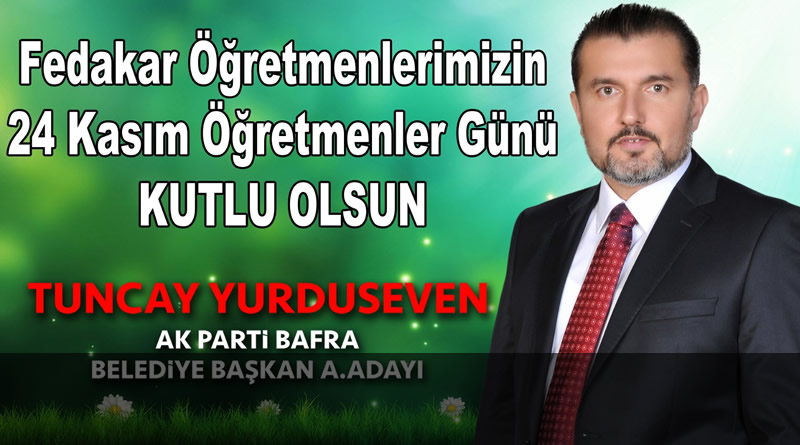 Ak Parti Bafra Belediye Başkan A. Adayı Tuncay Yurduseven Öğretmenler Günü sebebi ile mesaj yayınladı. Yurduseven yayınladığı mesajında ” Fedakar öğretmenlerimizin 24 Kasım Öğretmenler günü kutlu olsun” dedi.
