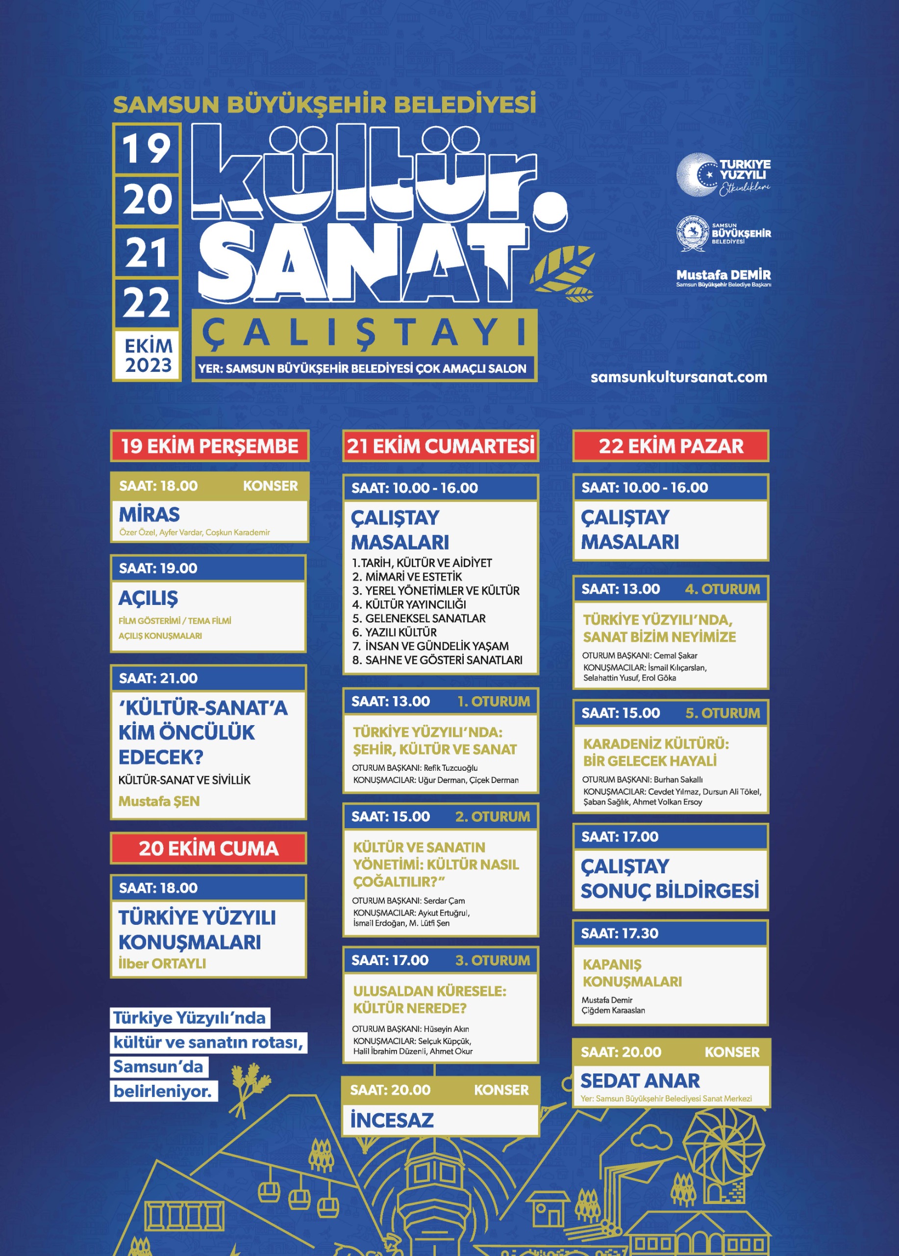 Samsun Büyükşehir Belediyesi tarafından düzenlenen ‘Kültür ve Sanat Çalıştayı’ yarın başlıyor. Türkiye’nin sanat ve kültür alanındaki önemli isimlerinin Samsun’da bir araya geleceğini belirten Büyükşehir Belediye Başkanı Mustafa Demir, “Türkiye Yüzyılı’nda Kültür ve Sanatın Rotası Samsun’da belirleniyor’ mottosuyla düzenlediğimiz bu organizasyonu kentimiz ve ülkemiz için çok önemsiyoruz.” dedi.Samsun Büyükşehir Belediyesi kültür ve sanat alanında çok önemli bir organizasyona ev sahipliği yapacak. 19-20-21-22 Ekim tarihleri arasında Kültür ve Sosyal İşler Dairesi Başkanlığı tarafından Büyükşehir Belediyesi Çok Amaçlı Salon’da ‘Kültür ve Sanat Çalıştayı’ düzenlenecek. “Türkiye Yüzyılı’nda Kültür ve Sanatın Rotası Samsun’da belirleniyor” mottosuyla gerçekleştirilecek olan Çalıştayın açılış programı yarın (19 Ekim) saat 19:00’da Büyükşehir belediyesi Çok amaçlı Salon’da düzenlenecek. Çevre, Şehircilik ve İklim Değişikliği Bakanı Mehmet Özhaseki’nin de katılacağı Çalıştayda ayrıca Türkiye’nin ve Samsun’un önde gelen kültür ve sanat insanlarının katılacağı 5 büyük panel gerçekleştirilecek. Çalıştayda 20 Ekim Cuma Günü saat 18:00’da ise Tarihçi Prof. Dr. İlber Ortaylı da ‘Türkiye Yüzyılı Konuşmaları’ kapsamında konferans verecek.SAMSUN’UN KÜLTÜR SANAT HARİTASI ÇIKARILACAKSekiz tematik masanın kurulacağı Çalıştay bölümünde ise yerel ve ulusal katılımcılar tarafından Samsun’un kültür sanat haritası çıkarılacak. Yaklaşık 90 kişinin yer alacağı bu bölümde tarih, kültür ve aidiyet, şehir mimari ve estetik, şehir, yerel yönetimler ve kültür politikaları, şehir ve kültür yayıncılığı, şehir ve geleneksel sanatlar, şehir ve yazılı kültür, şehir, insanlar ve gündelik yaşam, sahne ve gösteri sanatları başlıkları altında konular masaya yatırılacak. Çalıştay kapsamında ayrıca Sedat Anar, Miras, ve İncesaz müzik grupları konser verecek. ‘KENTİMİZ VE ÜLKEMİZ İÇİN ÇOK ÖNEMLİ’Çalıştayın, Türkiye’nin sanat ve kültür alanında önemli isimlerini Samsun’da bir araya getireceğini belirten Büyükşehir Belediye Başkanı Mustafa Demir, “Türkiye Yüzyılı’nda Kültür ve Sanatın Rotası Samsun’da belirleniyor’ mottosuyla düzenlediğimiz bu organizasyonu kentimiz ve ülkemiz için çok önemsiyoruz. ‘Öncü şehir Samsun’ vizyonuyla kentimizde dev bütçeli yatırımları hayata geçirirken bir yandan da kültür ve sanat alanında öncü organizasyonları düzenliyoruz. Büyükşehir Belediyesi olarak kültür ve sanat faaliyetlerine büyük önem veriyoruz. Sanat ve kültürün her zaman ön planda tutulduğu çalışmaları hayata geçiriyoruz. Kültür ve Sanat Çalıştayı’mız da bu kapsamda düzenlediğimiz çok önemli etkinliklerden birisi. Tüm vatandaşlarımızı bu değerli organizasyona katılmaya davet ediyorum.” diye konuştu.Köksal ÖNER