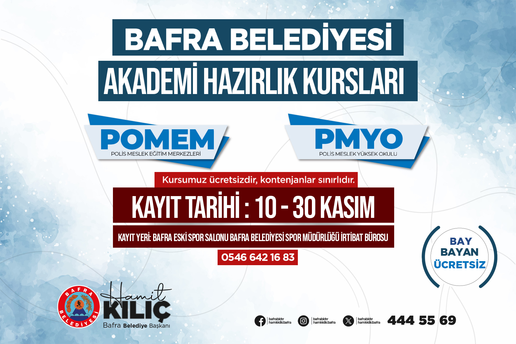 Polis Meslek Eğitim Merkezleri (POMEM) ve Polis Meslek Okulu (PMYO) kurslarına katılmak isteyenler kayıtlarını eski Kapalı Spor Salonu’nda yer alan Bafra Belediyesi irtibat bürosuna yaptıracaklar.