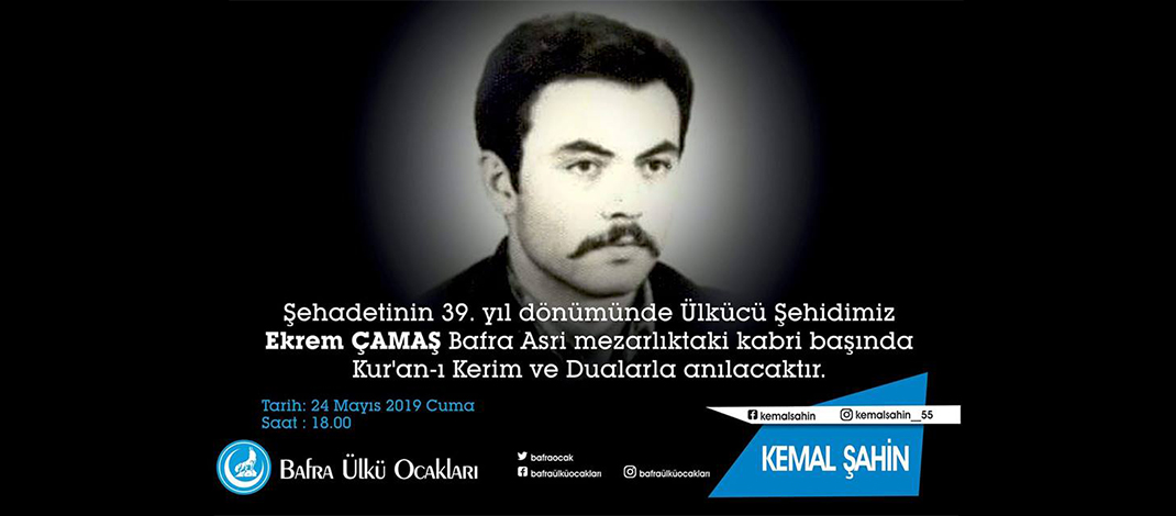 Bafra Ülkü Ocakları olarak Trabzon Karadeniz Teknik üniversitesinde okurken 24 yaşında şehadet şerbetini içen ağabeyimiz Ekrem Çamaş ı şehadetinin 39. Yıl dönümünde 24 Mayıs Cuma günü saat 18:00 da Bafra asri mezarlıktaki kabri başında Kurani kerim ve dualarla anacağız. Merhum şehidimize ve tüm şehitlerimize bu vesileyle bir kez daha yüce Allah’tan rahmet diliyorum. 24 Mayıs Cuma günü Saat: 18:00 da tüm Ülküdaşlarımızı ve Bafralı hemşehrilerimizi Ekrem ağabeyimizin kabri başındaki anmamıza bekliyoruz.