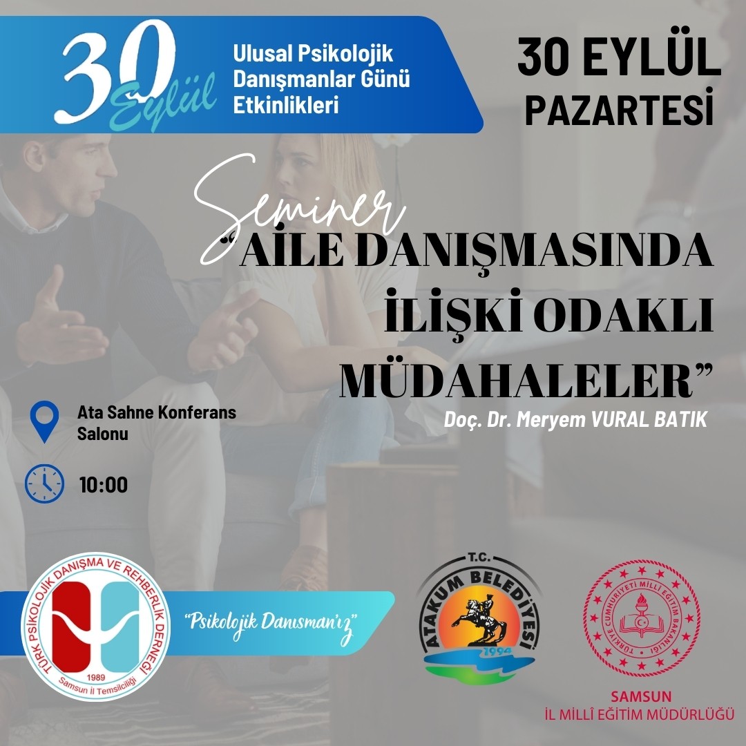 Türk Psikolojik Danışma ve Rehberlik Derneği Samsun İl Temsilciliği, Samsun İl Milli Eğitim Müdürlüğü ve Atakum Belediyesi iş birliğinde 30 Eylül Ulusal Psikolojik Danışmanlar Günü dolayısıyla, Ata Sahne’de kutlama programı düzenleniyor. Psikolojik danışmanların katılımıyla gerçekleştirilecek programda, Ondokuz Mayıs Üniversitesi Öğretim Üyesi Doç. Dr. Meryem Vural Batık, ‘Aile Danışmasında İlişki Odaklı Müdahaleler’ konulu seminer verecek. Program, 30 Eylül Pazartesi günü saat 10.00’ da başlayacak.