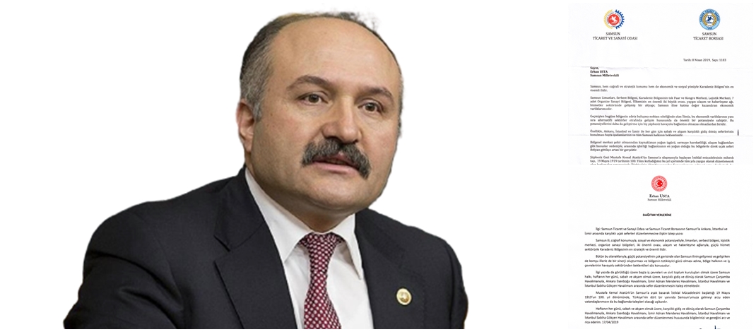 Bağımsız Samsun Milletvekili Erhan Usta, Samsun Ticaret ve Sanayi Odasının ve Samsun Ticaret Borsasının Samsun’la Ankara, İstanbul ve İzmir arasında karşılıklı uçak seferleri düzenlenmesine ilişkin destek çağrısına kayıtsız kalmadı ve THY Yönetim Kuruluna ve Ulaştırma ve Altyapı Bakanlığına resmi olarak başvuruda bulundu.