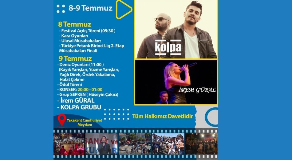 Yakakent Belediyesi tarafından organize edilen ve bu yıl 49cusunu gerçekleştireceği “Yakakent Belediyesi Kültür Sanat ve Deniz Oyunları Festivali” 8-9 Temmuz tarihleri arasında başlıyor.BİRİNDEN GÜZEL ETKİNLİKLER YER ALIYOR 8 Temmuz saat 09.30’da açılış töreni ile başlayacak olan festival Türkiye Petank Birinci Lig 2’inci Etap Müsabakaları Finali ile devam edecek. 9 Temmuz saat 11.00 itibariyle deniz oyunları (yüzme yarışmaları, yağlı direk, ördek yakalama, halat çekme vb. yarışmaları yapılacak. Yarışmaların ardından çeşitli branşlarda dereceye girenlere ödüller verilecek. Günün sonunda Grup SEPKEN, İrem Güral ve KOLPA Grubu sahne alacak.Köksal ÖNER