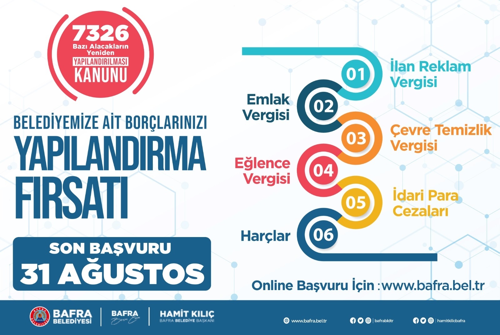 Bafra Belediyesi; Emlak Vergisi, İlan ve Reklam Vergisi, Çevre Temizlik Vergisi, Eğlence Vergisi, İdari Para Cezaları ve Harç kalemlerindeki tüm borçlarda yapılandırma fırsatı sunuyor.